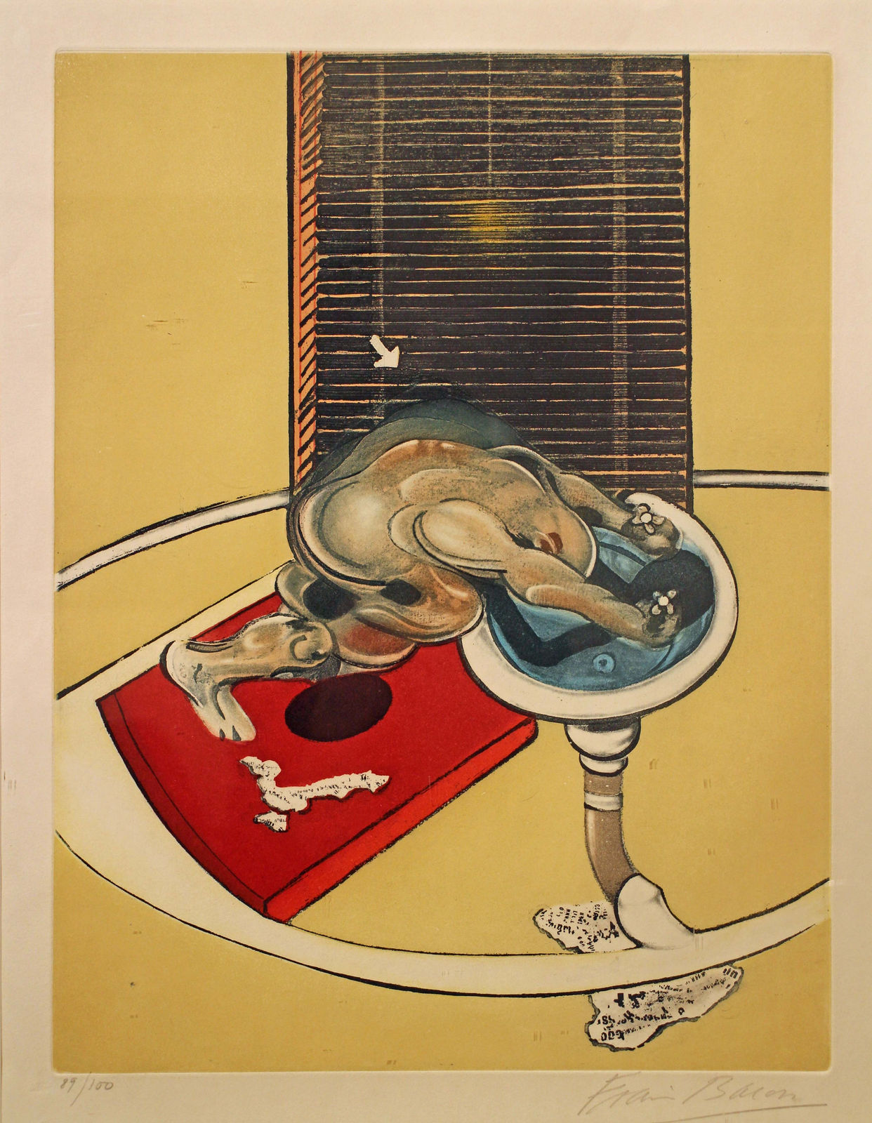 Alongside this remarkable show featuring three pivotal works by Francis Bacon that will be displayed in the UK for the first time in at least three decades, we are delighted to present Bacon's eerie 'Figure at a wash-basin' (1976). Contorted over a sink in a dimly lit bathroom, this vulnerable nude figure comes from a key series of works from the 1970s that captured the artist's internal torment and response to the suicide of his lover George Dyer. This particular print is based upon an oil painting of the same title from the Museo de Arte Contemporáneo de Caracas, which was included in major retrospectives at Tate, London (1985) and Centres Pompidou, Paris (1996).